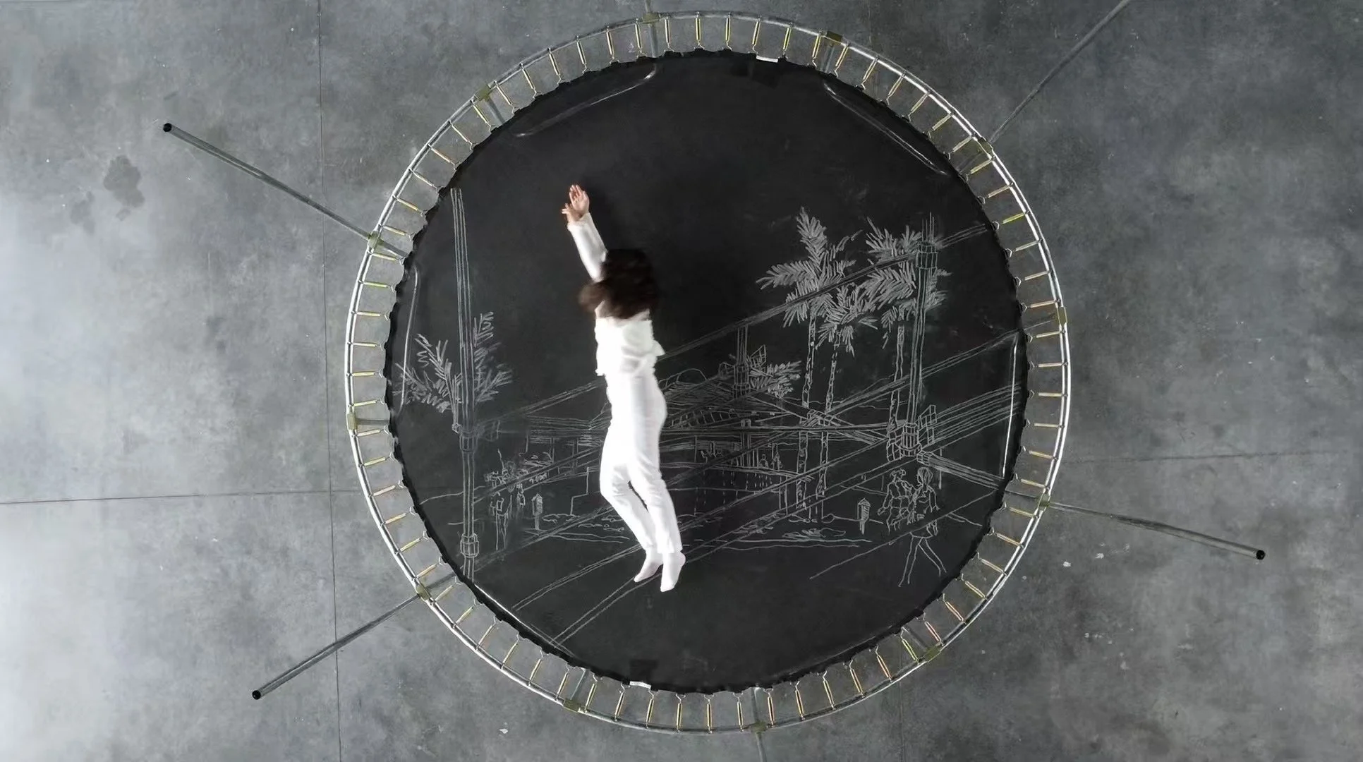 The chalk drawing combines my grandfather’s late 1950s architectural renderings with my observational scaffolding sketches of DTLA. Through the movement of jumping, rolling, and playing on the trampoline, the chalk drawing gradually disappears.